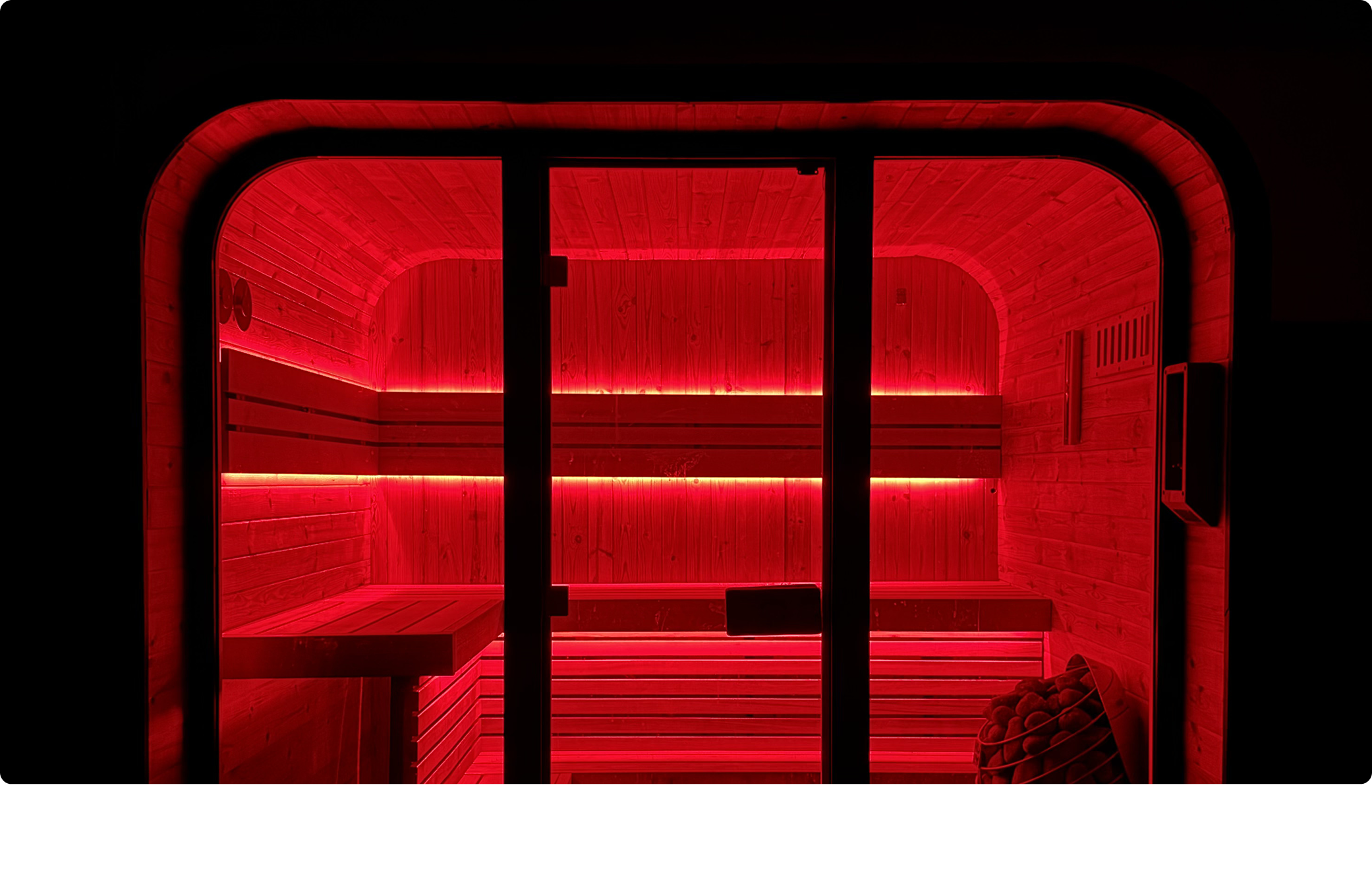 Custom blue-light-free LED sauna lighting enhances relaxation, recovery, and your natural circadian rhythm