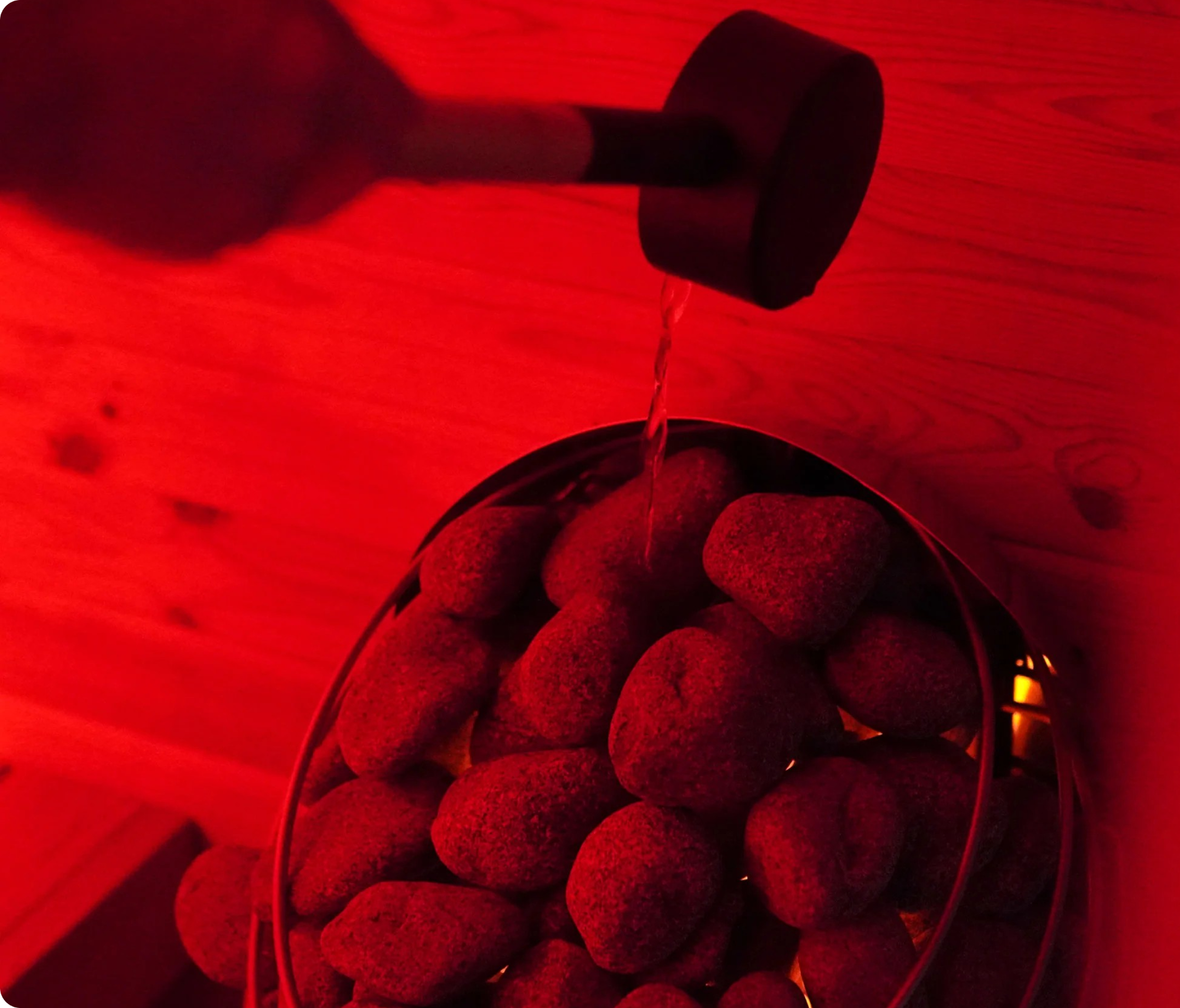 Steam option – Pour water over the stones to create löyly (steam), lifting humidity and intensifying the heat.